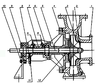 RY型熱油泵為單級懸臂式結(jié)構(gòu)分為腳支撐和中心支撐,泵的進口為軸向吸入,出口為中心垂直向上。泵和驅(qū)動電機通過彈性聯(lián)軸器合裝于同一底座上。整個機組無需加冷系統(tǒng)。