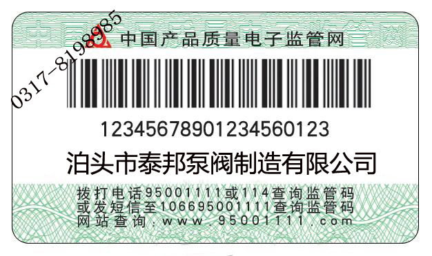 泊頭市泰邦泵閥制造有限公司自2006年12月1 日出廠的產(chǎn)品,在產(chǎn)品合格證上粘貼長方圓形監(jiān)管碼標簽,上有20位數(shù)字,這就是產(chǎn)品監(jiān)管碼。因此,我公司生產(chǎn)的每件產(chǎn)品都將有一個“電子身份證”??梢岳霉潭娫?、手機短信、互聯(lián)網(wǎng)、超市終端等網(wǎng)絡(luò)通訊設(shè)備對電子監(jiān)管碼進行查詢,辨別真?zhèn)?。查詢辦法如下: